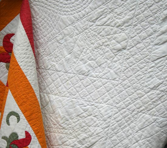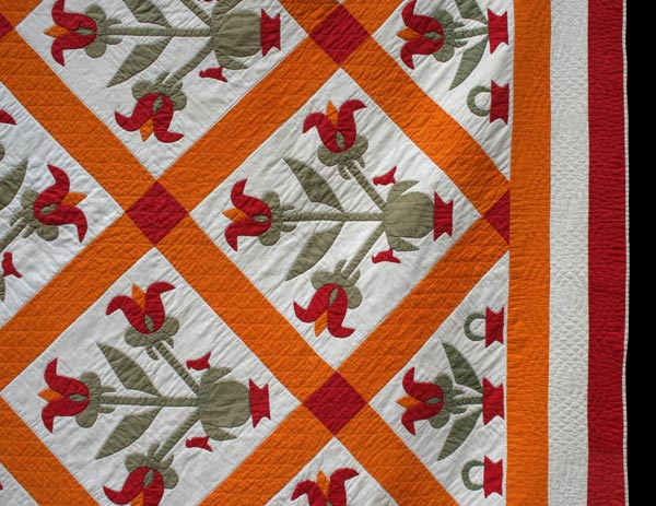 In this cheerful, folky 19th century applique (and reverse applique) quilt,