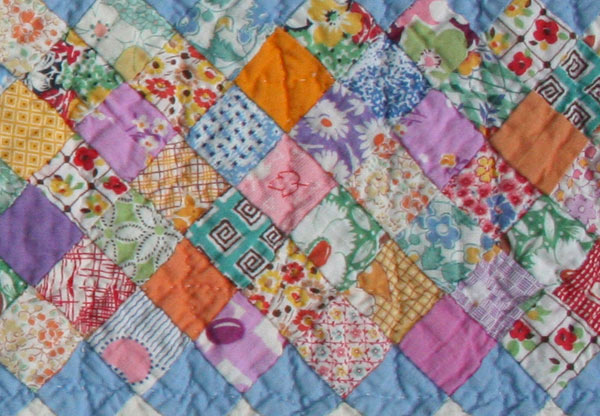 The quilt maker was careful to use a scale appropriate to a small quilt. Each of the hundreds of little square measures only 1 inch square.