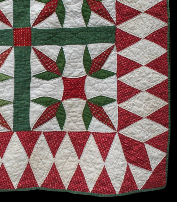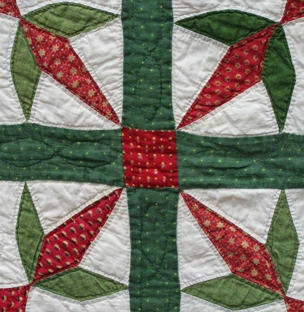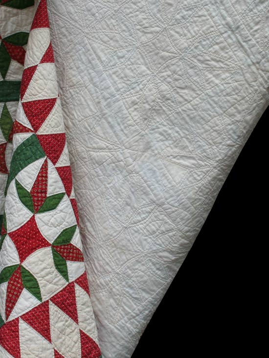 The design, featuring curved seams, is pieced, and is traditionally called "Turkey Tracks."