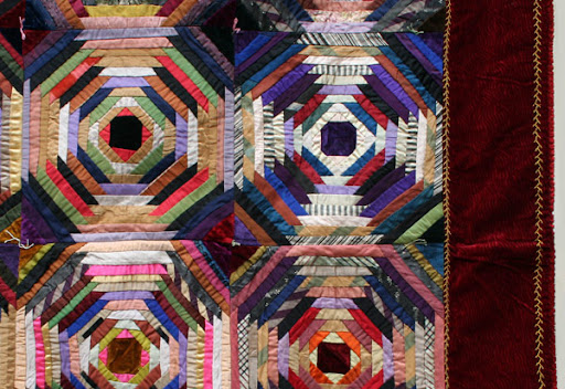 We see silks, velvets, taffeta and brocades in many Log Cabin quilts